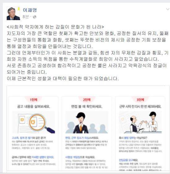 이재명 성남시장은 19일 자신의 페이스북을 통해 "사회적 약자에게 하는 갑질이 문화가 된 나라"라는 글을 올렸다.
