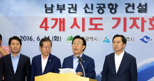 권영진 대구시장(왼쪽 첫 번째), 홍준표 경남도지사(〃 두 번째), 김관용 경북도지사(〃 세 번째), 김기현 울산시장(〃 네 번째) 등 영남권 4개 시·도지사가 지난 14일 밀양시청 회의실에서 남부권 신공항 건설을 촉구하는 기자회견을 갖고 있다. 밀양=연합뉴스