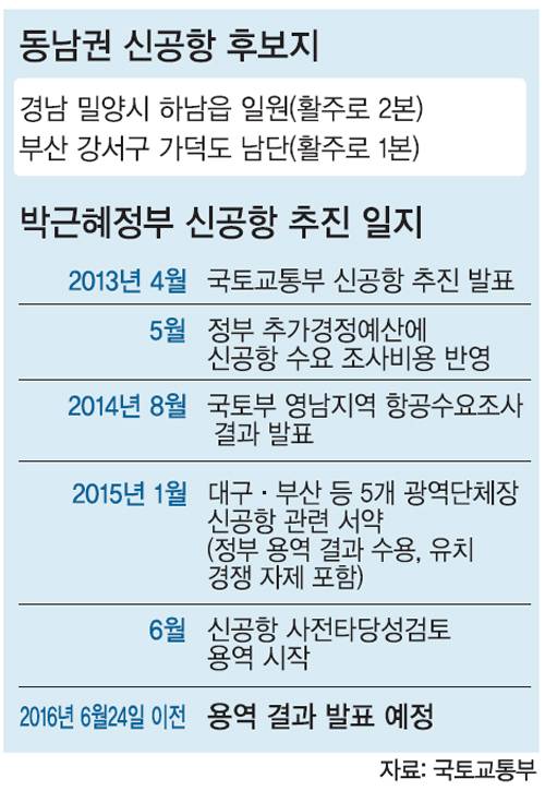부산을 제외한 대구, 경북 등 4개 지자체는 대구상공회의소 회의실에서 ‘남부권 신공항 대정부 공개 결의대회’로 맞불을 놓는다. 정부 쪽에서는 이런 지자체의 움직임에 내심 불쾌하다는 반응이다. 10년 전인 2006년 참여정부 때 신공항 건설의 필요성이 제기됐을 때부터 지역 갈등이 워낙 컸다. 이에 국토부는 지난해 1월 19일 부산과 대구, 경북, 경남 등 영남권 5개 지자체장에게 유치경쟁을 자제하고, 객관성을 지닌 해외 전문기관의 용역을 바탕으로 한 정부의 입지 결정 발표를 수용한다는 서약부터 받았다. 국토부가 지난해 6월 사전타당성 검토 용역을 ADPi에 맡긴 것도 이런 근거에서다. 그러나 발표가 임박하면서 이 서약은 헌신짝처럼 버려졌다.