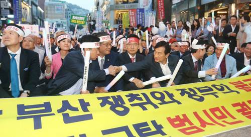 지난 14일 부산 중구 광복로에서 열린 가덕신공항 유치를 촉구하는 부산시민 궐기대회에 참가한 김영춘 더민주 의원(왼쪽 두 번째)이 유재중 새누리당 의원(〃 다섯 번째)과 악수하고 있다. 부산=연합뉴스