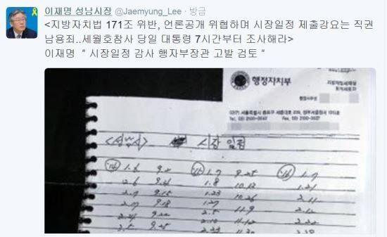이재명 성남시장은 20일 자신의 트위터를 통해 시장일정 감사 행자부장관 고발 검토"라는 기사를 링크한 뒤 "지방자치법 171조 위반, 언론공개 위협하며 시장일정 제출강요는 직권남용죄"라고 했다.