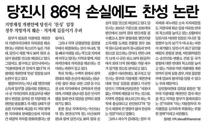 당진에서 발행되는 풀뿌리 주간 신문인 <당진시대>는 20일자 '당진시 86억 손실에도 찬성 논란' 제목의 기사에서 '정부의 지방재정 개편안'으로 당진시에서만 연 86억 원의 손실이 발생할 것으로 예상하는데도 당진시가 개편안에 '찬성' 견해를 밝혔다'고 비판했다.