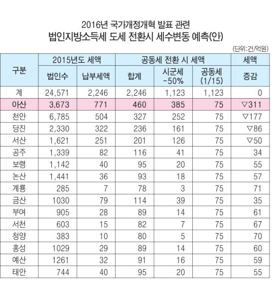 | ▲ 법인 지방소득세를 도세로 전환할 경우 충남 시군별 세수 변경 예상안. |
