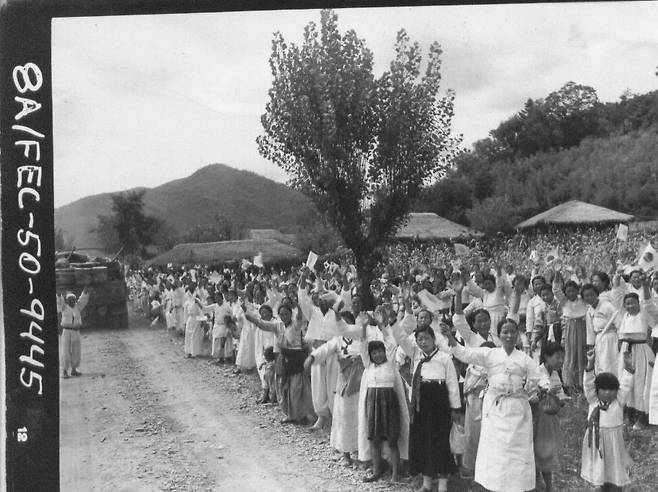| ▲ 흰옷 입은 백성들은 국군이나 유엔군이 지날 때면 태극기를, 인민군이 지날 때면 인공기를 흔들며 목숨을 부지했다(1950. 9. 27. 경인가도) |