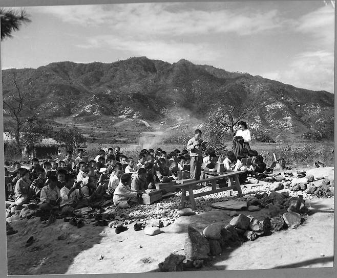 | ▲ 전란으로 학교 교실이 잿더미가 되자 불 탄 자리에서 수업을 하고 있다(1953. 10. 서울 근교). |