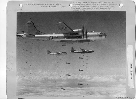 | ▲ 미 공군B-29 전투기들이 북한군 진지에 폭탄을 투하하고 있다(1950. 8. 11.). |