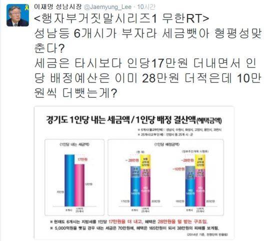 이 시장은 "성남등 6개시가 부자라 세금뺏아 형평성맞춘다?"라며 "세금은 타시보다 인당17만원 더내면서 인당 배정예산은 이미 28만원 더적은데 10만원씩 더뺏는게?"라고 했다.