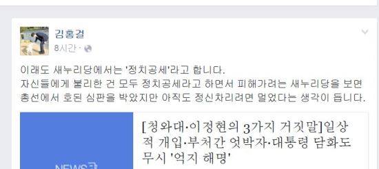 김 전 위원장은 "이래도 새누리당에서는 '정치공세'라고 합니다"라며 "자신들에게 불리한 건 모두 정치공세라고 하면서 피해가려는 새누리당을 보면 총선에서 호된 심판을 받았지만 아직도 정신차리려면 멀었다는 생각이 듭니다"라고 했다.