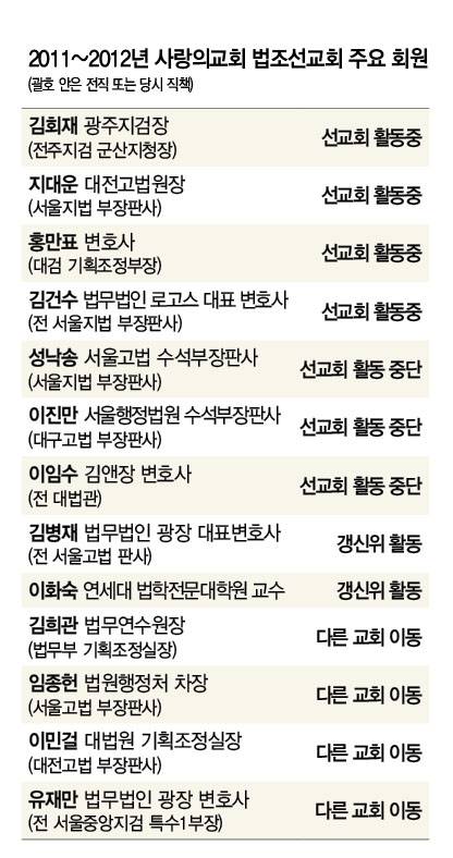 김회재 검사와 지대운 판사, 김건수 변호사와 홍만표 변호사는 모두 사랑의교회 법조선교회 회원이란 공통점이 있다. 사랑의교회 법조선교회는 1996년도 김병재 법무법인 광장 대표변호사(전 서울고법판사)와 백현기 법무법인 화우 파트너 변호사(전 서울고법판사), 심동섭 소망교도소장(전 서울고검 검사)이 주축이 돼서 만들어졌다. 판사, 검사, 변호사, 법대 교수 등 법조계 인사들은 물론 경찰, 기자 등 비법조인들도 일부 포함돼 있다. 이들은 ‘법 실천을 통한 정의사회 구현’을 표방하며 기독교법 사상 관련 세미나 개최와 번역 출판, 교인들의 법률 상담 등을 해왔다. 법조선교회 회원이었다가 오 목사의 논문 표절을 조사하고 지금은 갱신위에서 활동하고 있는 이화숙 연세대 법학전문대학원 교수는 “대형교회인 여의도순복음교회와 온누리교회도 법조선교회를 만들었지만 서초동 법조단지 가까이에 있는 사랑의교회만큼 지속해서 운영되지는 못했다”고 말했다.
