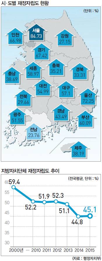 사실상 지방자치가 외면받고 있는 상황은 지자체의 재정사용액과 재정자립도 수준을 보면 더욱 극명해진다. 전국 지자체의 재정사용액은 전체 392조7113억원 중 57.5%로, 중앙정부의 42.5%보다 더 많다. 반면 지방재정자립도는 지방자치가 다시 시작된 원년인 1995년의 63.5%에서 2015년 45.1%까지 낮아졌다. 지방의 자체사업 비중도 2008년 42.3%에서 2014년 34.5%로 낮아졌다. 즉 지방은 원청과 하청업체 간의 관계처럼 고유의 자치사무보다는 중앙정부가 하달한 사무를 더 많이 처리하면서도 그에 필요한 재정을 확보하는 것은 중앙정부에 기댈 수밖에 없는 형편이다.
