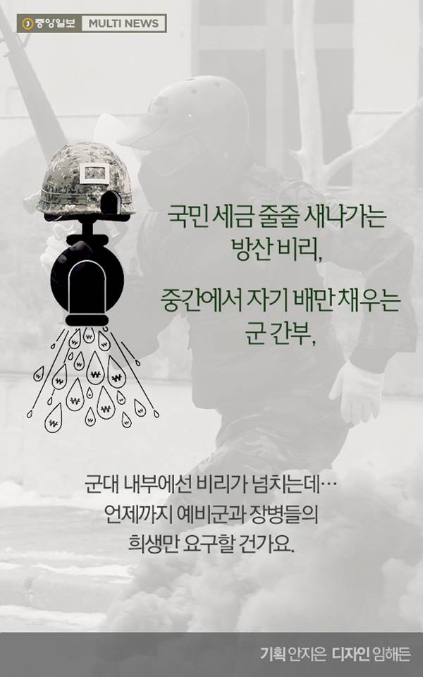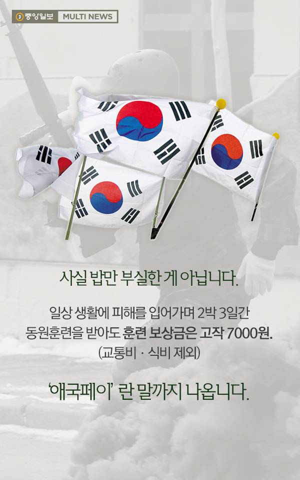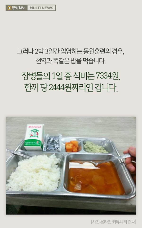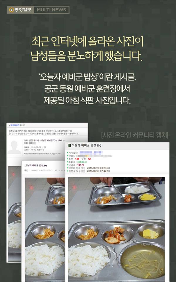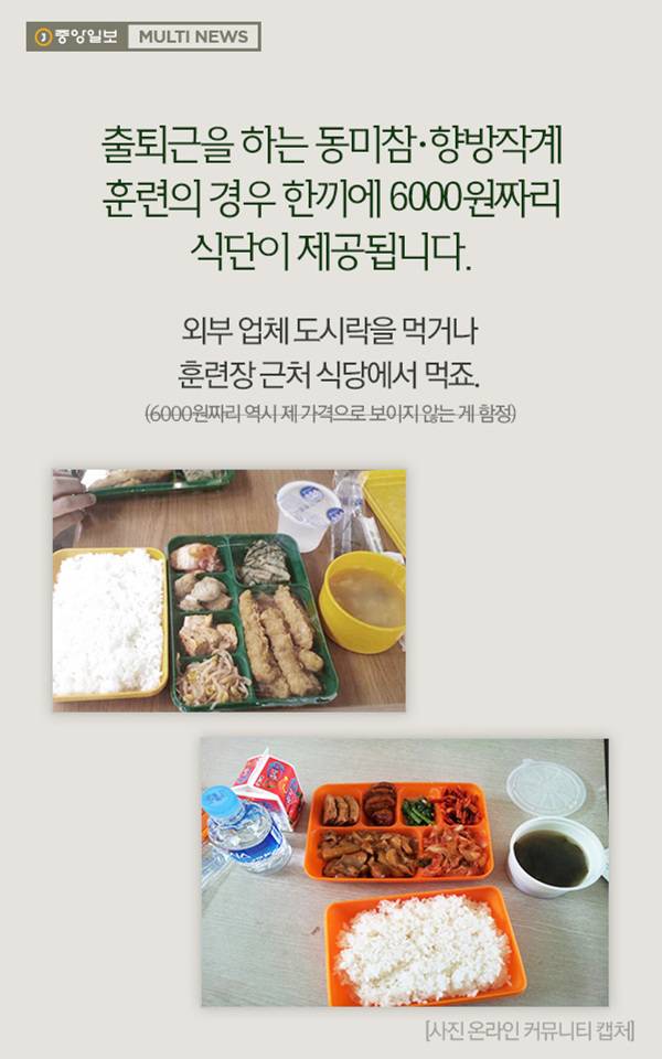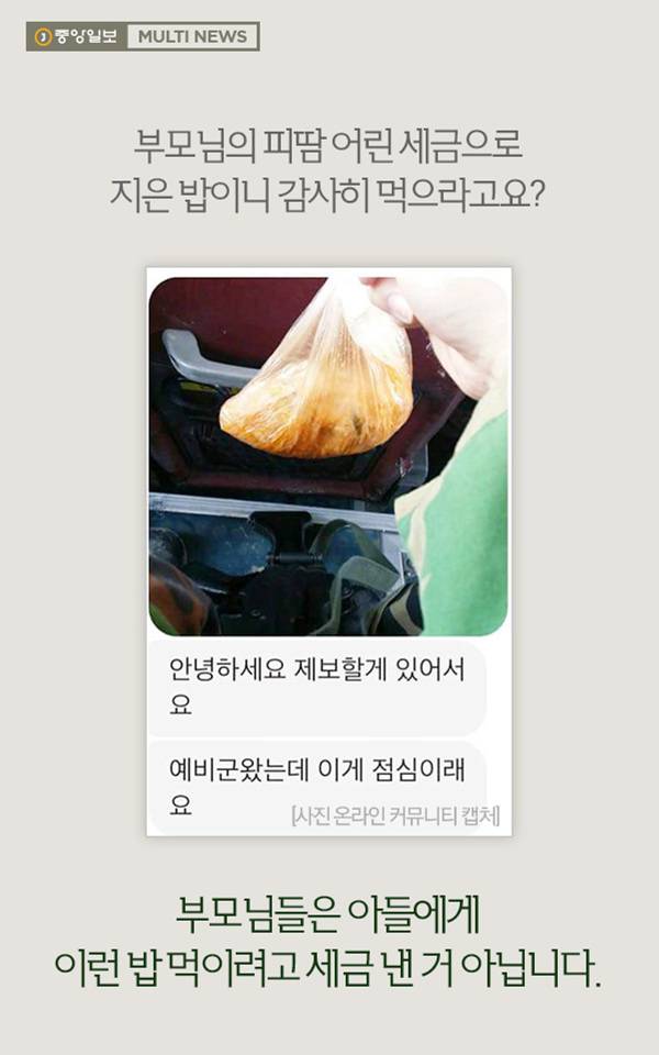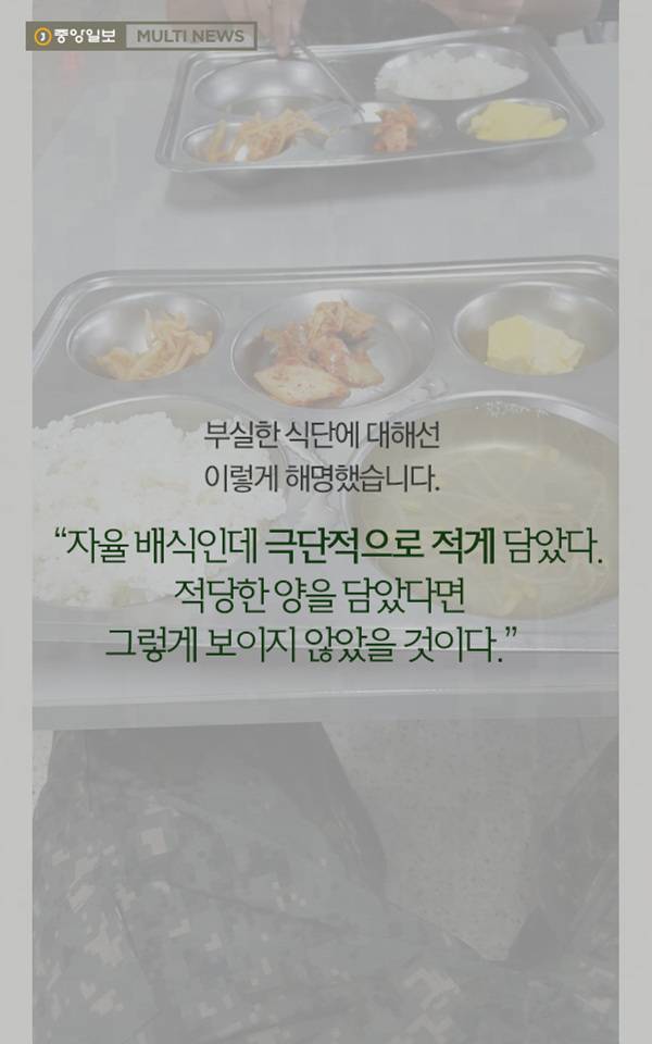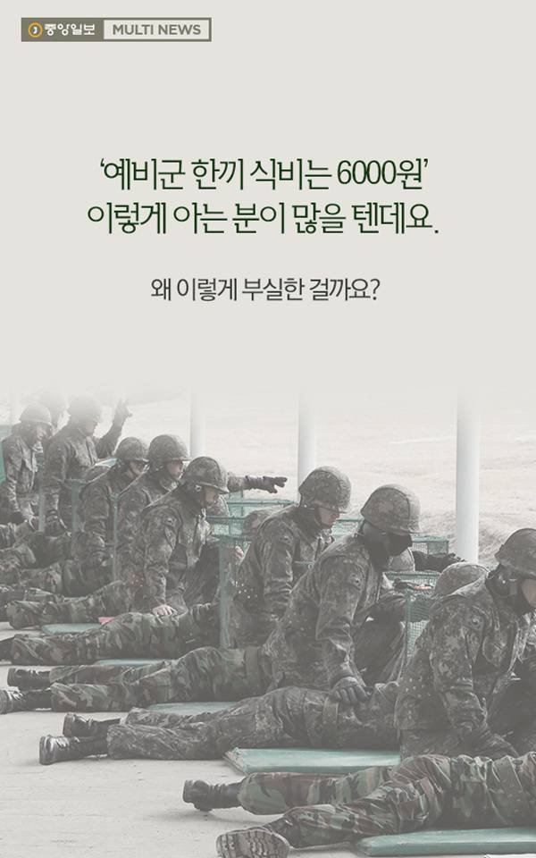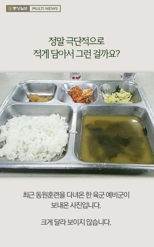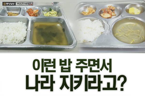 [카드뉴스] 부실한 군대 식단..이런 밥 주면서 나라 지키라고? 안지은.임해든 입력 2016. 07. 07. 00:04 수정 2016. 07. 07. 20:51 댓글 0 번역 설정 번역beta Translated by kaka i 한국어 - English 영어 日本語 일본어 简体中文 중국어 Nederlands 네델란드어 Deutsch 독일어 Русский 러시아어 Malaysia 말레이시아어 বাঙ্গোল ভাষা 벵골어 tiếng Việt 베트남어 Español 스페인어 اللغة العربية 아랍어 Italiano 이탈리아어 bahasa Indonesia 인도네시아어 ภาษาไทย 태국어 Türkçe 터키어 Português 포르투갈어 Français 프랑스어 हिन्दी 힌디어 닫기 번역중 Now in translation 글씨크기 조절하기 글자크기 설정 파란원을 좌우로 움직이시면 글자크기가 변경 됩니다. 가 매우 작은 폰트 작은 폰트 보통 폰트 큰 폰트 매우 큰 폰트 가 이 글자크기로 변경됩니다.(예시) 가장 빠른 뉴스가 있고 다양한 정보, 쌍방향 소통이 숨쉬는 다음뉴스를 만나보세요. 다음뉴스는 국내외 주요이슈와 실시간 속보, 문화생활 및 다양한 분야의 뉴스를 입체적으로 전달하고 있습니다. 닫기 [카드뉴스] 부실한 군대 밥…이거 먹고 나라 지키라고? Copyrightⓒ중앙일보 All Rights Reserved. 이 기사에 대해 어떻게 생각하시나요? 중앙일보 주요뉴스 해당 언론사로 이동합니다. "오빠폰에 몰카" 與의원실 비서 여동생이 신고 김환기에 이우환까지···300억 경매 나온다 은지원, 제주 카페서 6명 모임 논란···"반성"