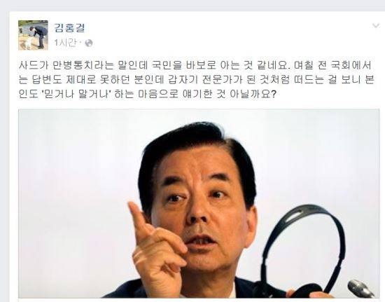 김 전 위원장은 "며칠 전 국회에서는 답변도 제대로 못하던 분인데 갑자기 전문가가 된 것처럼 떠드는 걸 보니 본인도 '믿거나 말거나' 하는 마음으로 얘기한 것 아닐까요?"라고 했다.