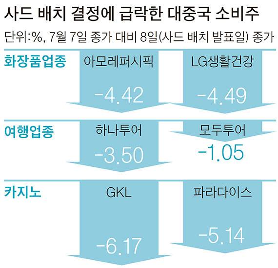 유통·관광업계는 중국 정부가 ‘한국 관광 제한’에 나서는 상황을 가장 걱정하고 있다. 전체 매출의 60~70%를 중국 관광객에게 의존하는 면세점 업계도 크게 긴장하고 있다. 롯데면세점 관계자는 “중국 정부가 각 성이나 여행사를 통해 한국행 여행조건을 까다롭게 만드는 등 간단한 행정조치만으로도 영향력을 행사할 수 있다”며 “중국 정부의 후속 조치가 어떻게 나오느냐가 중요하다”고 말했다. 지난 8일 주식 시장에선 아모레퍼시픽과 LG생활건강 같은 중국 매출이 많은 화장품 관련 기업의 주가가 4%가량 떨어졌다.