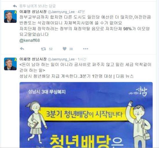 이 시장은 "성남시 청년배당 지급 계속한다..3분기 1만명 대상"이라며 "돈이 남아 하는 일이 아니라 공사비로 퍼주지 않고 밀린 세금 악착같이 걷어 하는 일"이라고 했다.