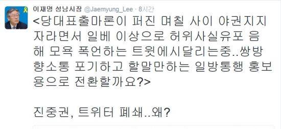 이재명 성남시장은 19일 자신의 트위터를 통해 "당대표출마론이 퍼진 며칠 사이 야권 지지자라면서 일베 이상으로 허위사실유포 음해 모욕 폭언하는 트윗에 시달리는중"이라며 "쌍방향소통 포기하고 할말만하는 일방통행 홍보용으로 전환할까요?"라고 되물었다.
