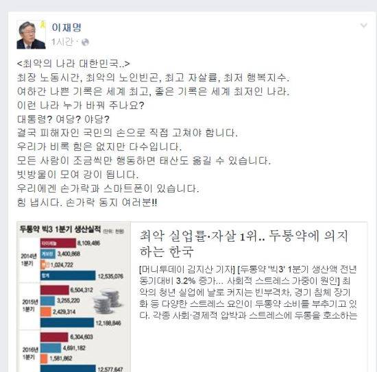 이재명 성남시장은 19일 자신의 페이스북을 통해 "최악의 나라 대한민국.."이라는 글을 올렸다.