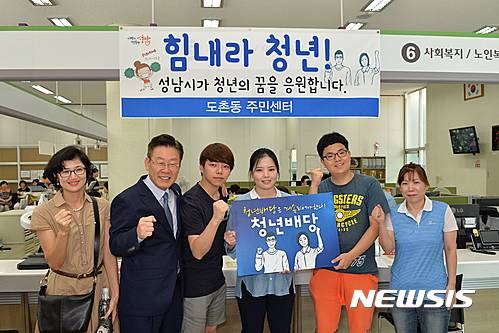 【성남=뉴시스】 이정하 기자 = 이재명 경기 성남시장은 3분기 청년배당 지급 첫날인 20일 신흥2동주민센터와 도촌동주민센터를 방문해 청년배당과 산후조리지원금을 수령하러 온 청년들과 산모들을 격려했다.