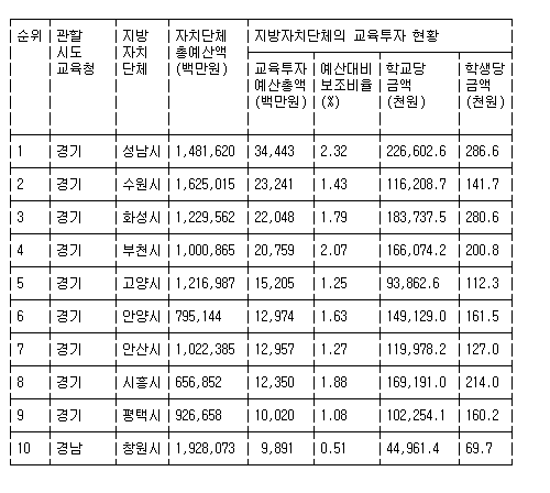 100억원 이상 교육경비로 투자한 지자체는 성남시(344억원), 수원시(232억원), 화성시(220억원), 부천시(207억원), 고양시(152억원), 안양시(129억원), 안산시(129억원), 시흥시(123억원), 평택시(100억원) 등 9곳이다.
