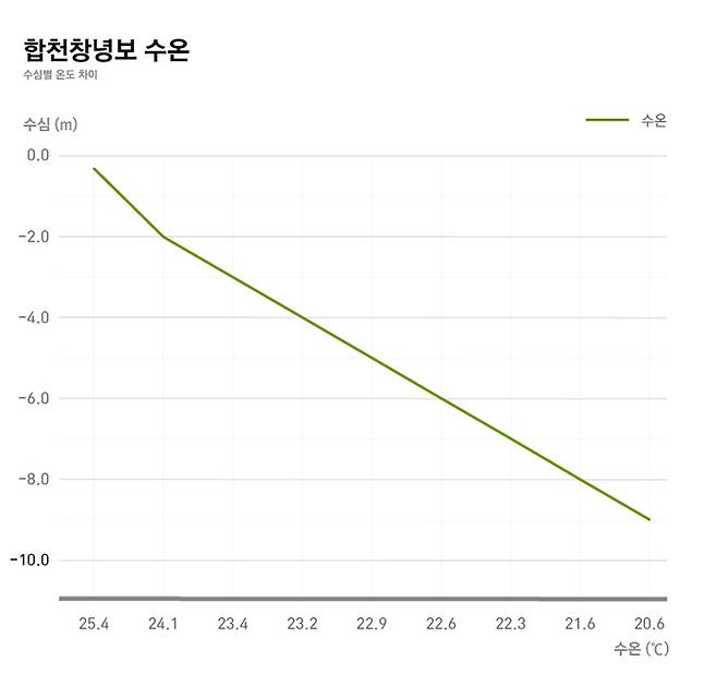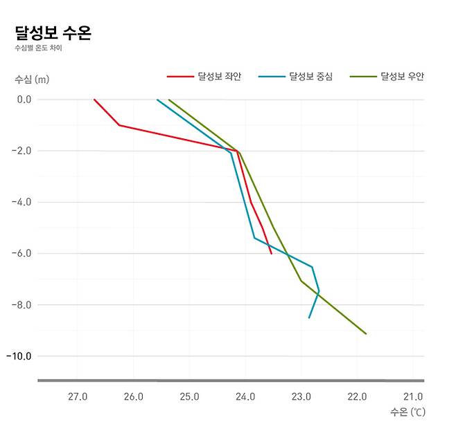 이번 조사에서 표층과 심층 간에 수온 차이도 극심한 것으로 나타났습니다. 달성보의 경우 5도 이상, 합천보는 4.8도, 함안보는 7.5도 차이를 보였습니다.