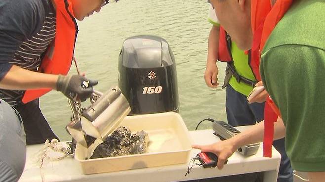 바닥은 모래 대신 시커먼 펄 층이 두텁게 형성되고 있는 것으로 나타났습니다. 수심이 깊은 곳은 음용수로 사용할 수 없는 농업용수 수준으로 오염돼 있습니다.
