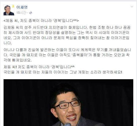 이재명 성남시장은 8일 자신의 페이스북을 통해 "제동 씨, 저도 종북이 아니라 ‘경북’입니다^^"라고 했다.