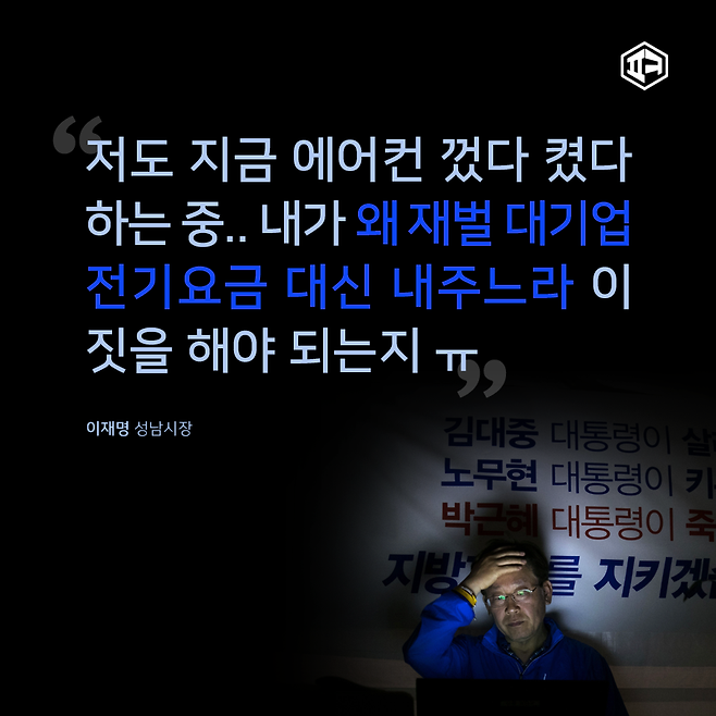 이재명 성남시장도 트위터를 통해 불합리한 누진제를 지적하며 개편 요구 목소리에 힘을 보태고 있습니다. 9일에는 정부가 "부자감세 우려"라는 희한한 논리로 "누진제 개편 없다"고 못 박자, 이 시장이 "정말 국민을 X로 아는구나. 부자감세 해도 되니까 누진제 폐지하라"고 직격탄을 날리기도 했지요. 산업통상자원부 에어컨을 꺼버리고 싶은 심정입니다.