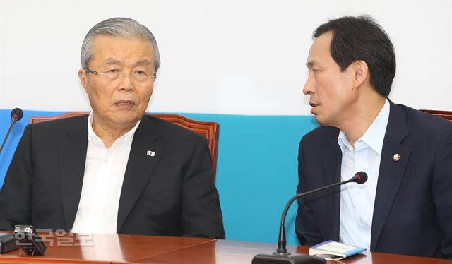 /그림 1 더불어민주당 김종인 비상대책위 대표(왼쪽)와 우상호 원내대표가 지난 10일 오전 국회에서 열린 비대위원회의에서 대화를 나누고 있다. 배우한 기자