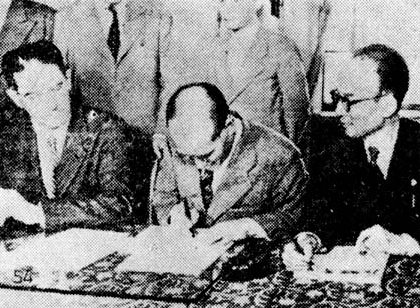 | ▲ 왼쪽부터 무초, 이범석, 윤치영. 미군정청 간부로부터 행정권을 이양받는 이범석 총리와 윤치영 내무장관, 이범석의 뒷줄에서 지켜보는 사람은 유진오. |