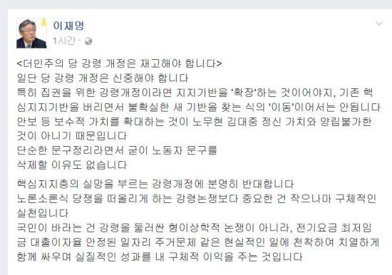 이재명 성남시장은 14일 자신의 페이스북을 통해 "더민주의 당 강령 개정은 재고해야 합니다"라며 "일단 당 강령 개정은 신중해야 합니다"라고 했다.