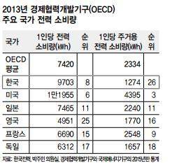 1인당 가정용 전력 소비량은 미국이 4395㎾h로 한국의 3.4배였고, 프랑스(2548㎾h)가 2배, 일본(2240㎾h)이 1.8배, 대표적 친환경·신재생에너지 국가인 독일(1657㎾h)도 1.3배였다. 한국보다 1인당 가정용 전력 소비가 적은 8개국 중 한국보다 소득 수준이 높은 나라는 이탈리아뿐이다.