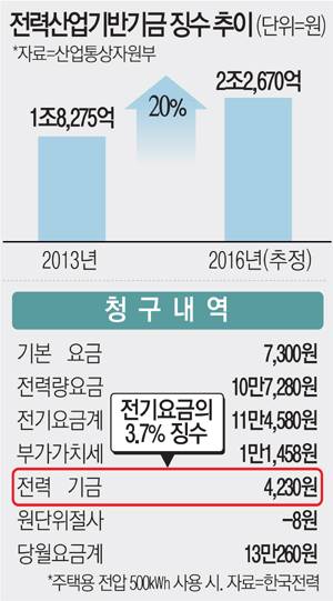 가정용 전기요금 누진제에서 폭발한 '전기료 민심'이 이번엔 전력기금으로 튀고 있다. 전기요금 고지서를 살펴보면 전력기금 항목이 눈에 띈다. 전력기금의 정식 이름은 '전력산업기반기금'이다. 전기사업법에 따라 전기요금의 3.7%를 징수하는 일종의 준조세에 해당한다.