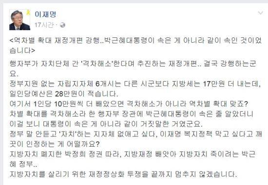 이재명 성남시장은 24일 자신의 페이스북을 통해 "역차별 확대 재정개편 강행..박근혜 대통령이 속은 게 아니라 같이 속인 것이었습니다"라고 했다.