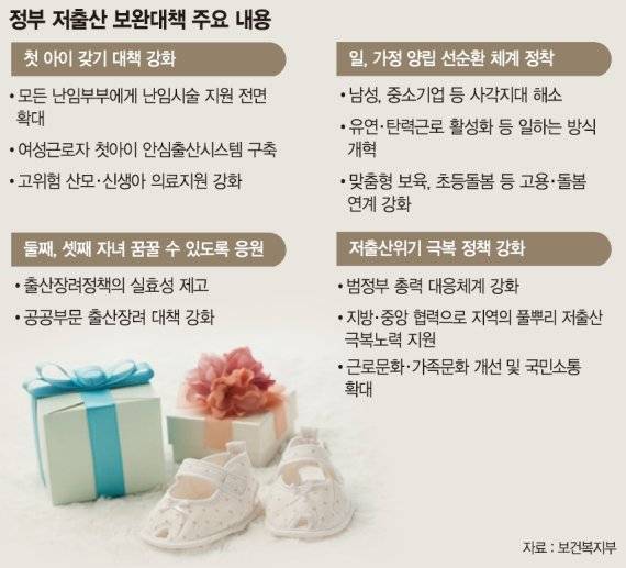 정부가 25일 발표한 '저출산 보완 대책'은 오는 9월부터 아이를 원하는 모든 난임부부에게 난임 시술 의료비를 지원하고 내년 7월에는 태어나는 둘째 자녀부터 '아빠의달' 휴직급여 상한액을 200만원으로 늘린다는 것이 골자다.