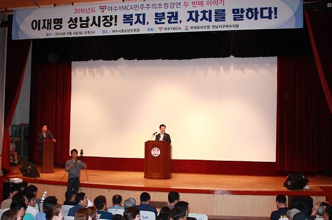 | ▲ 4일 여수시 쌍봉 청소년수련관에서 '민주주의 강좌 시리즈' 이재명 초청강연회의 모습 |