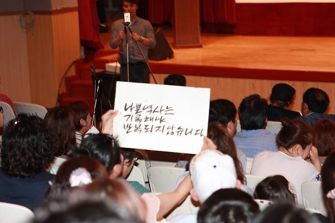| ▲ 4일 여수시 쌍봉 청소년수련관에서 '민주주의 강좌 시리즈' 이재명 초청강연회에 한 시민이 나쁜역사를 기록해야 한다는 글귀를 들어보이고 있다 |