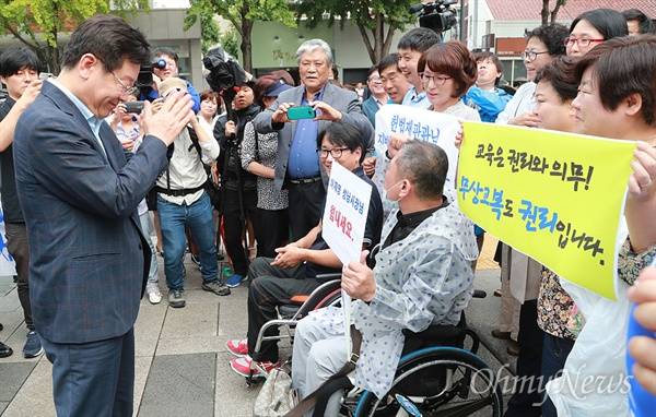 | ▲ 이재명, 연호하는 지지자들에게 "이재명 말고 민주주주 외쳐 달라" 이재명 성남시장이 8일 오후 서울 종로구 헌법재판소 대심판정에서 열릴 지방교부세법 시행령 관련 권한쟁의심판 공개변론을 앞두고 연호하는 지지자들에게 두 손을 모으며 화답하고 있다. 이날 이 시장은 "지방자치단체는 정부에서 독립해 고유의 자치권과 자치재원으로 주민복지정책을 펼칠 권한이 있다"라며 "(현재) 박근혜 정부의 지방자치 탄압이 극에 달하고 있다"라고 비판했다. |