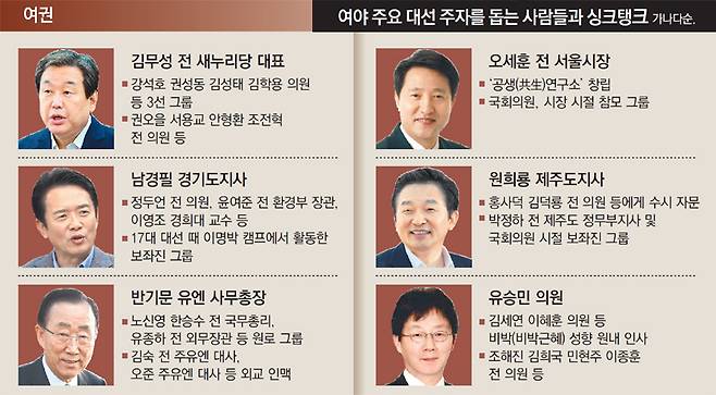 오세훈 전 서울시장은 20대 총선에서 출마한 서울 종로에 ‘공생(共生)연구소’를 열고 본격적인 대선 정책 구상에 돌입했다. 개헌 주장을 담은 책을 낸 데 이어 다음 달 공존과 상생, 통일 구상을 담은 책을 잇달아 출간할 예정이다. 오 전 시장 주변에는 강철원 전 서울시 정무조정실장 등 옛 서울시 인맥이 주로 포진해 있다.