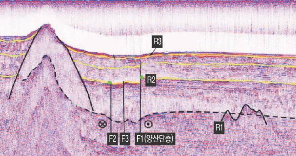| [해저에 남은 양산단층 활성화 증거] 한국해양과학기술원 연구진이 촬영한 양산단층의 해저 모습이 처음으로 공개됐다. 양산단층이 연장된 해저단층 F1, F2, F3 가운데 가장 오른쪽의 F1이 양산단층이며 F2, F3는 양산단층 시스템에 속한 단층들이다. 연구진은 신생대 제4기(약 260만년 전부터 현재) 이후 퇴적된 R2 지점 위의 지층이 변형된 사실을 통해 F1 단층이 신생대 제4기에 활동한 사실을 확인했다. 국회 농림축산식품해양수산위원회 김현권 의원 제공 |