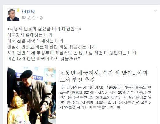이 시장은 22일 자신의 페이스북에 ‘혁명적 변화가 필요한 나라 대한민국’이라는 제목과 함께 조동빈 애국지사의 별세 소식을 올렸다.