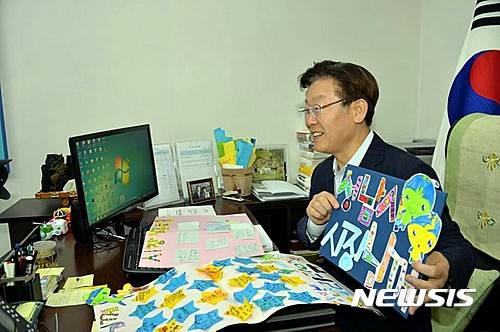 【성남=뉴시스】 이정하 기자 = 한 초등학생이 이재명 성남시장에게 보낸 손팻말의 글씨를 잘못 해석, 이 시장을 프랑스의 절대군주 루이 14세에 비유하며 맹비난했던 성남시의원이 결국 공개사과하며 고개를 숙였다.