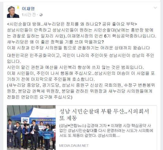 이재명 성남시장은 18일 자신의 페이스북을 통해 "시민순찰대 방해..새누리당은 정치를 왜 하나요? 공유 좋아요 부탁"이라고 적었다.