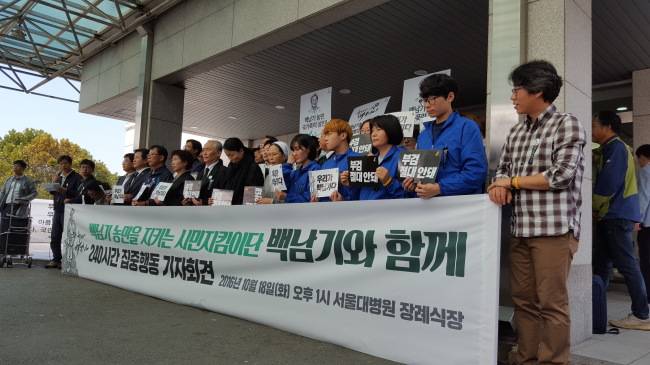 앞서 서울 종로경찰서는 “이날 오전 10시 부검영장을 강제집행한다”고 백남기 투쟁본부 측에 통보했다. 이어 오전 10시 홍완선 종로경찰서장이 형사들을 대동하고 서울대병원 장례식장을 찾아 영장 집행을 시도했다.