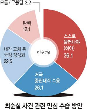 문화일보 창간 25주년(11월 1일) 기념 여론조사 결과, ‘최순실 국정농단 의혹사건’에 대한 민심 수습책으로 ‘박근혜 대통령이 스스로 대통령직에서 물러나야 한다’는 응답이 36.1%로 가장 높았고 ‘박 대통령이 여야 합의로 추천된 국무총리에게 권한을 대폭 이양하는 거국중립내각을 수용해야 한다’는 응답이 26.1%로 뒤를 이었다. ‘여야가 박 대통령 탄핵을 추진해야 한다’는 응답은 12.1%로 어떤 형태로든 박 대통령이 퇴진(하야+탄핵)해야 한다는 의견이 48.2%였다. ‘청와대 참모진과 내각을 교체한 뒤 박 대통령 중심으로 국정을 정상화해야 한다’는 주장에 대한 지지는 22.5%에 그쳤다. 이 같은 결과는 문화일보가 여론조사 전문기관 엠브레인(대표 최인수)에 의뢰, 지난 10월 29∼30일 실시한 조사에서 나왔다.