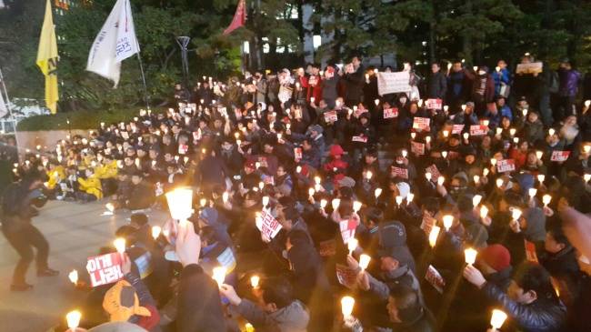 투쟁본부는 지난달 29일 주말 촛불집회 때 ”민중총궐기 1주년 집회를 여는 오는 12일까지 매일 저녁 집회를 여는 등 비상 시국 행동을 이어 가겠다“고 밝힌 바 있다. 이날 집회는 바로 그 첫 집회였다.