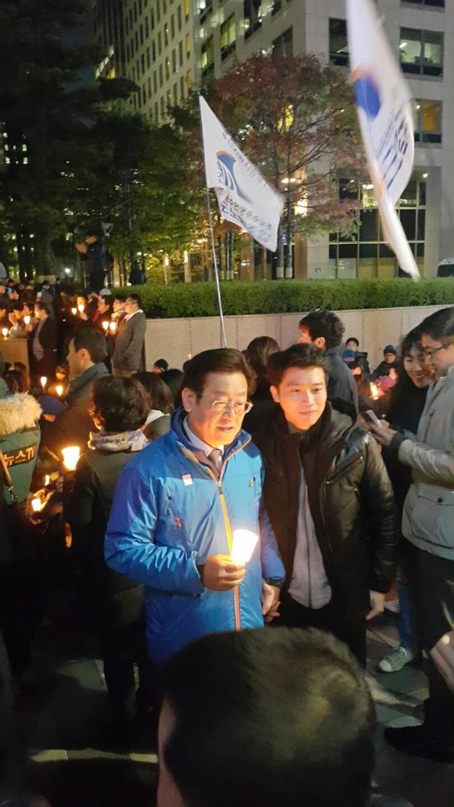 <사진2>진보 진영 시민단체들로 구성된 민중총궐기 투쟁본부(이하 투쟁본부)는 1일 오후 서울 중구 청계광장에서 ‘박근혜 하야 촉구 촛불집회’를 개최했다. 이날 청계광장에는 경찰 추산 900여 명(주최 측 추산 동일)이 운집했다. 투쟁본부는 지난달 29일 주말 촛불집회 때 ”민중총궐기 1주년 집회를 여는 오는 12일까지 매일 저녁 집회를 여는 등 비상 시국 행동을 이어 가겠다“고 밝힌 바 있다. 이날 집회는 바로 그 첫 집회였다. 집회에 참가한 이재명(왼쪽) 성남시장이 한 참가자와 기념촬영을 위해 포즈를 취하고 있다. 신동윤 기자/ realbighead@heraldcorp.com