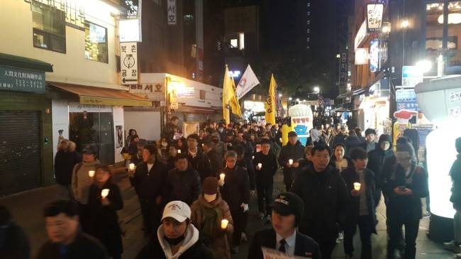 <사진3>진보 진영 시민단체들로 구성된 민중총궐기 투쟁본부(이하 투쟁본부)는 1일 오후 서울 중구 청계광장에서 ‘박근혜 하야 촉구 촛불집회’를 개최했다. 이날 청계광장에는 경찰 추산 900여 명(주최 측 추산 동일)이 운집했다. 투쟁본부는 지난달 29일 주말 촛불집회 때 ”민중총궐기 1주년 집회를 여는 오는 12일까지 매일 저녁 집회를 여는 등 비상 시국 행동을 이어 가겠다“고 밝힌 바 있다. 이날 집회는 바로 그 첫 집회였다. 참가자들이 촛불을 들고 인사동길을 행진하고 있다. 신동윤 기자/ realbighead@heraldcorp.com