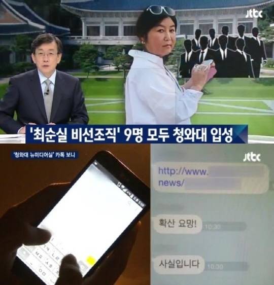 7일 JTBC '뉴스룸'은 최순실 사단 핵심인물이 모여있는 뉴미디어정책실의 업무내용이 담긴 카카오톡 내용을 입수해 이같이 보도했다.