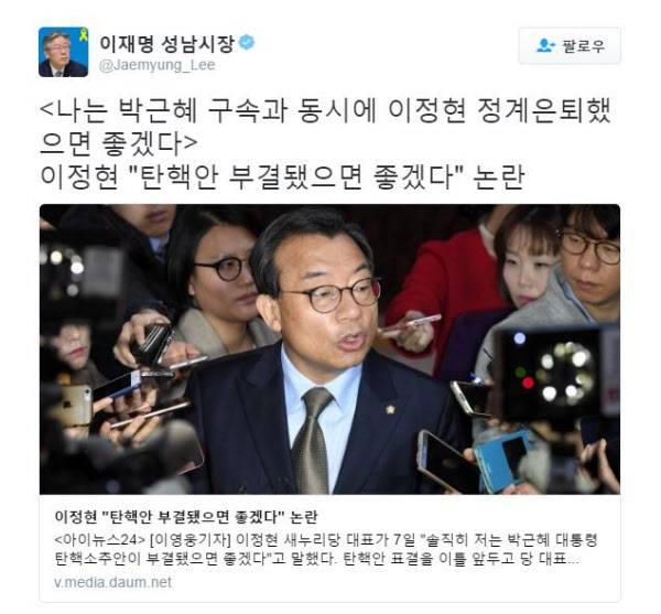 이 시장은 7일 자신의 트위터 계정을 통해 "나는 박근혜 구속과 동시에 이정현 정계은퇴 했으면 좋겠다"는 글을 게재했다.