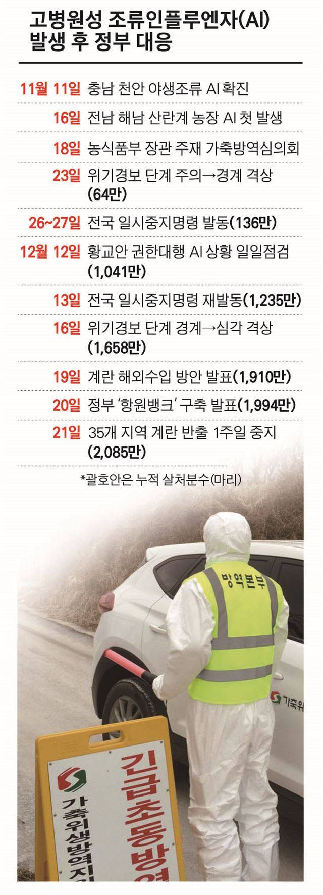 정부의 총체적인 관리 부실이 사상 최악의 AI 참사를 불러왔다는 지적이 점점 더 커지고 있다. 업무 태만과 늑장 조치, 사실 은폐, 그리고 허술한 대응까지 총체적인 문제점들이 곳곳에서 드러나고 있다. 그러는 사이 살처분된 닭, 오리 등 가금류는 2,000만마리를 넘어섰다. 농림축산식품부에 따르면 21일 현재 살처분된 닭.오리ㆍ메추리는 약 2,085만마리(살처분 예정 포함)에 달한다. 또 지난 16~17일 경기 과천의 서울대공원에서 폐사한 황새 2마리는 고병원성 H5N6형 AI 바이러스에 감염된 것으로 최종 확인됐다.