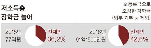 고려대는 성적장학금을 없애고 그 예산(34억원)을 저소득층 장학금, 학생자치 장학금 등으로 배분했다. 이에 따라 지난해 저소득층 장학금 예산은 91억1500만원(전체 214억원)으로 2015년(77억원)보다 크게 늘었다. 기초생활수급자에겐 매달(방학 포함) 30만~50만원의 생활비를 지원했다.
